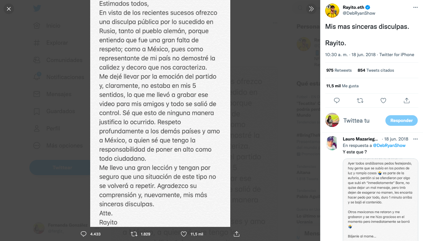 “En vista de los recientes sucesos ofrezco una disculpa pública por lo sucedido en Rusia, tanto al pueblo alemán, porque entiendo que fue una gran falta de respeto; como a México, pues como representante de mi país no demostré la calidez y decoro que nos caracteriza. Me dejé llevar por la emoción del partido y, claramente, no estaba en mis 5 sentidos, lo que me llevó a grabar ese video para mis amigos y todo se salió de control“, publicó en Twitter.