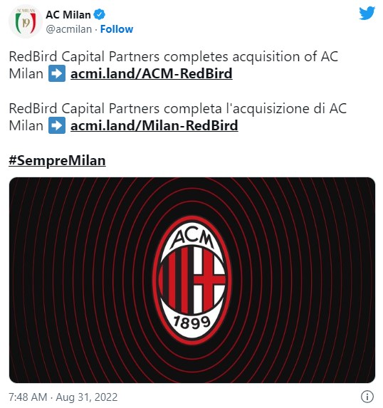 Se trata del fondo de inversión estadounidense RedBird Capital, el cual adquirió de manera oficial este miércoles al AC Milan. El club informó lo anterior por medio de un comunicado compartido este 31 de agosto.