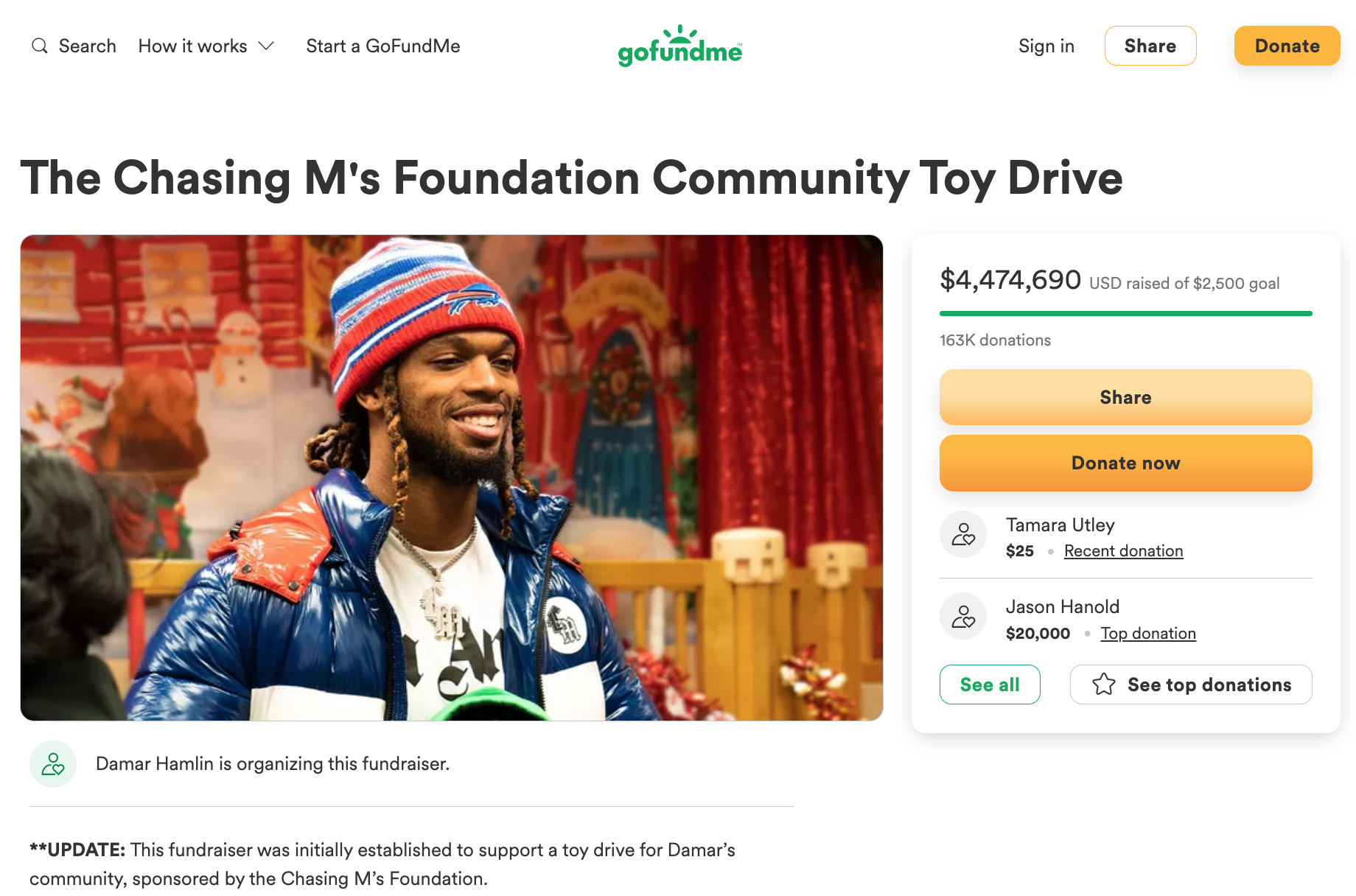 Y es que sí, Damar Hamlin creó una fundación para ayudar a niños (de su comunidad) con escasos recursos, Chasing M’s, a la cual comenzó a darle vida en al año 2020, el año de la pandemia, con el objetivo de recolectar juguetes y entregarlos a los pequeños durante las fiestas navideñas. La fundación también apoya colectas de regreso a la escuela, campamentos para niños y más.