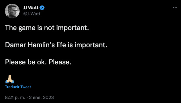 “El juego no es importante. La vida de Damar Hamlin es importante. Por favor, que esté bien. Por favor“, publicó en su cuenta de Twitter.