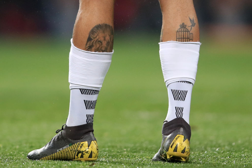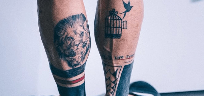 En el llamado “chamorro” izquierdo tiene un tatuaje de trébol de cuatro hojas, que significa la suerte. En el otro costado, tiene un león junto a un cordero, que significan las dos personalidades.