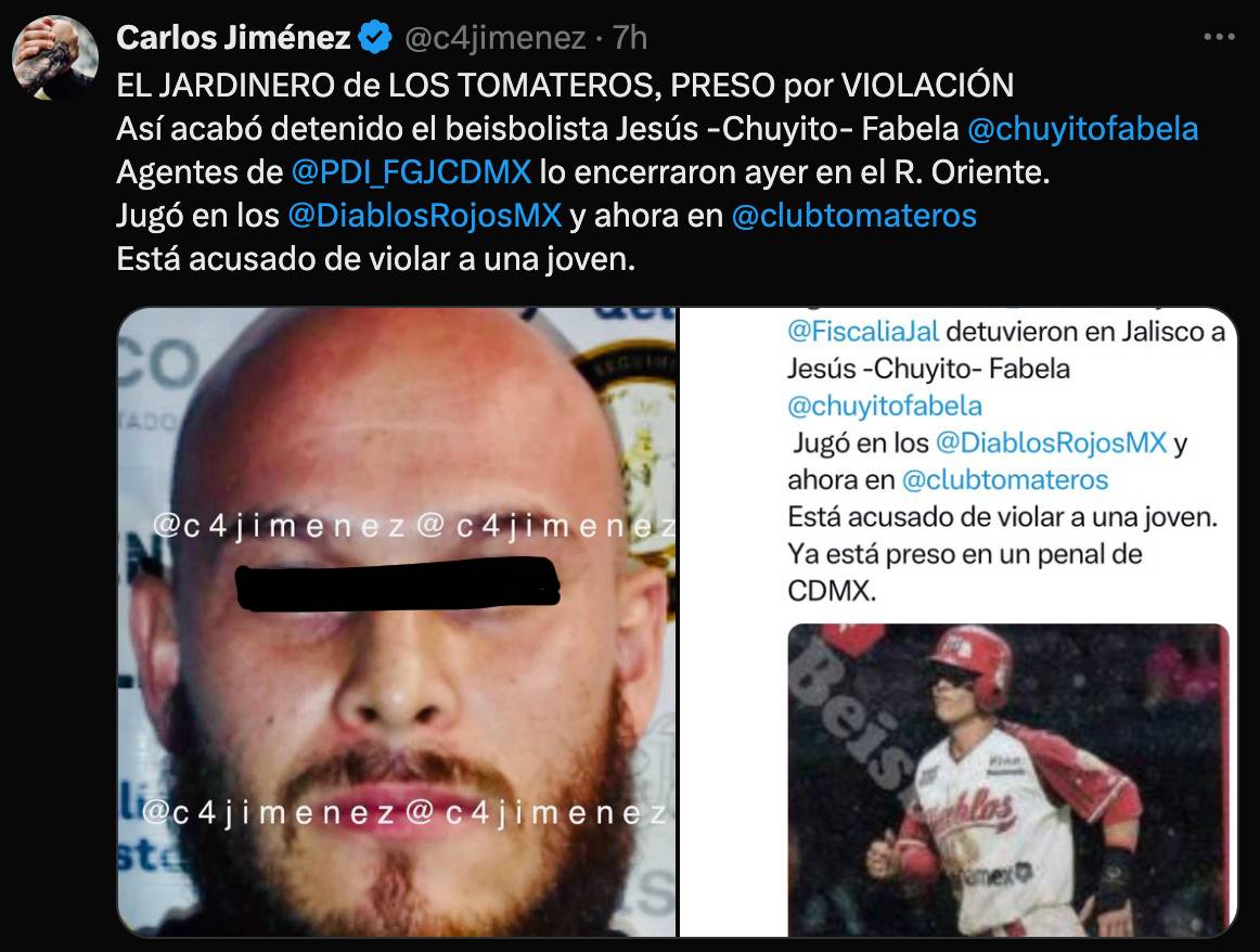 Horas después de que se diera a conocer la noticia, este lunes 2 de diciembre los Diablos Rojos confirmaron la detención del beisbolista Jesús Fabela, quien fue detenido en Jalisco por una acusación que tiene en su contra por el delito de violación.