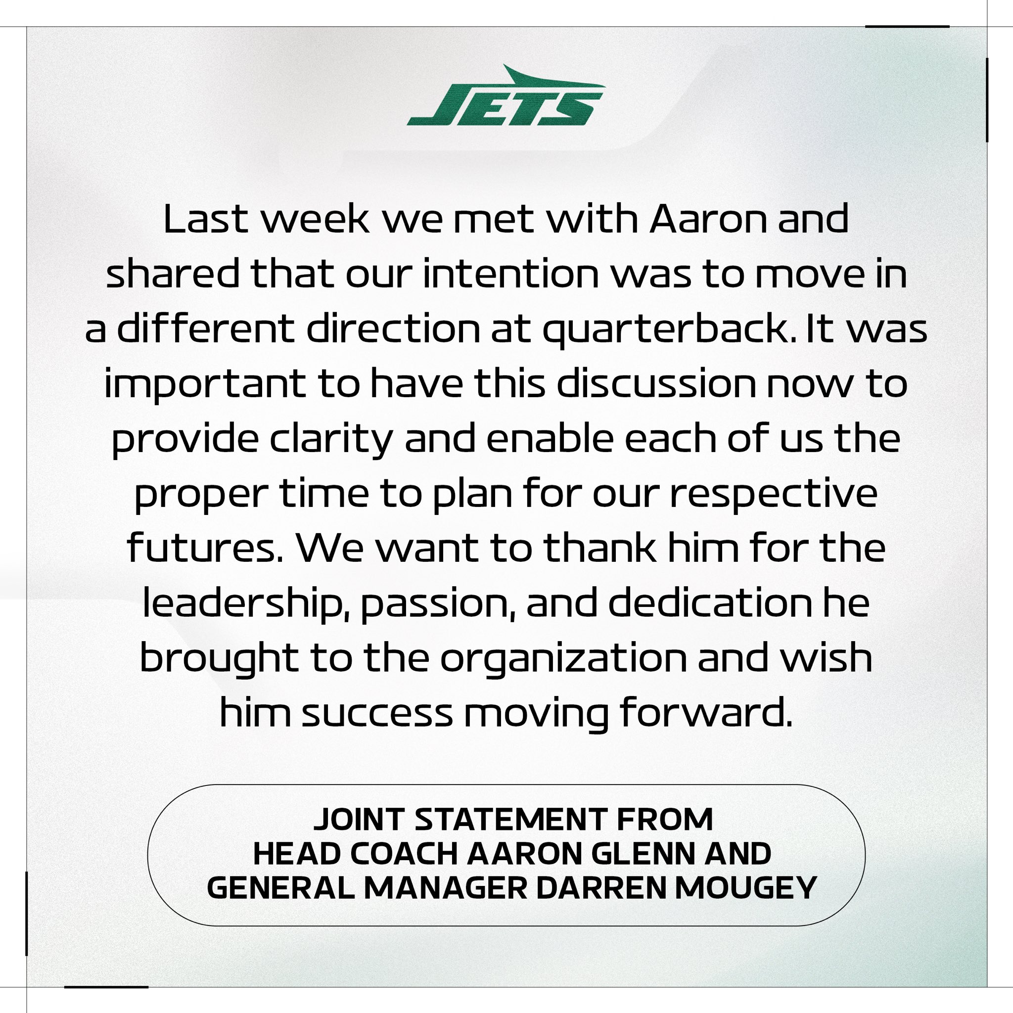 “La semana pasada nos reunimos con Aaron y le dijimos que nuestra intención es ir en una dirección diferente en la posición de mariscal de campo”, señala el comunicado publicado por los Jets este 13 de febrero. “Queremos agradecerle por el liderazgo, la pasión y la dedicación que trajo a la organización y le deseamos éxito en el futuro”.