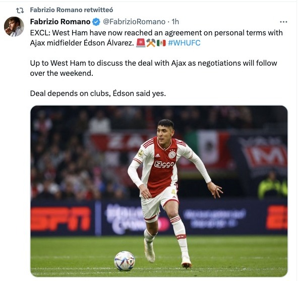 De acuerdo con la información del periodista Fabrizio Romano el futuro de Edson Álvarez está por definirse en los próximos días, pues el West Ham tiene la intención de unir a sus filas al mexicano propuesta que, según Romano, Edson ya aceptó.