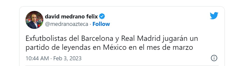 «Ahhhh pero entonces será sólo la transmisión del partido y ya…» Pues igual y no. David Medrano compartió en su propia cuenta de Twitter que justo en marzo, exfutbolistas de Barcelona y Real Madrid jugarán un partido de exhibición en México. Algo así como un duelo de leyendas.