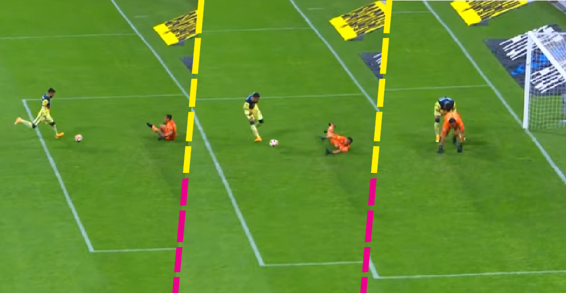 América consiguió el penal a os 53 minutos, cuando Sebastián Córdoba fue trompicado en el área. El contacto sobre el jugador azulcrema fue bastante claro por parte de Santiago Colombato, pero lo que convirtió la acción en algo controvertido, fue el hecho de que el jugador del América dio dos pasos más y cuando se dio cuenta que no alcanzaría el esférico, se dejó caer.