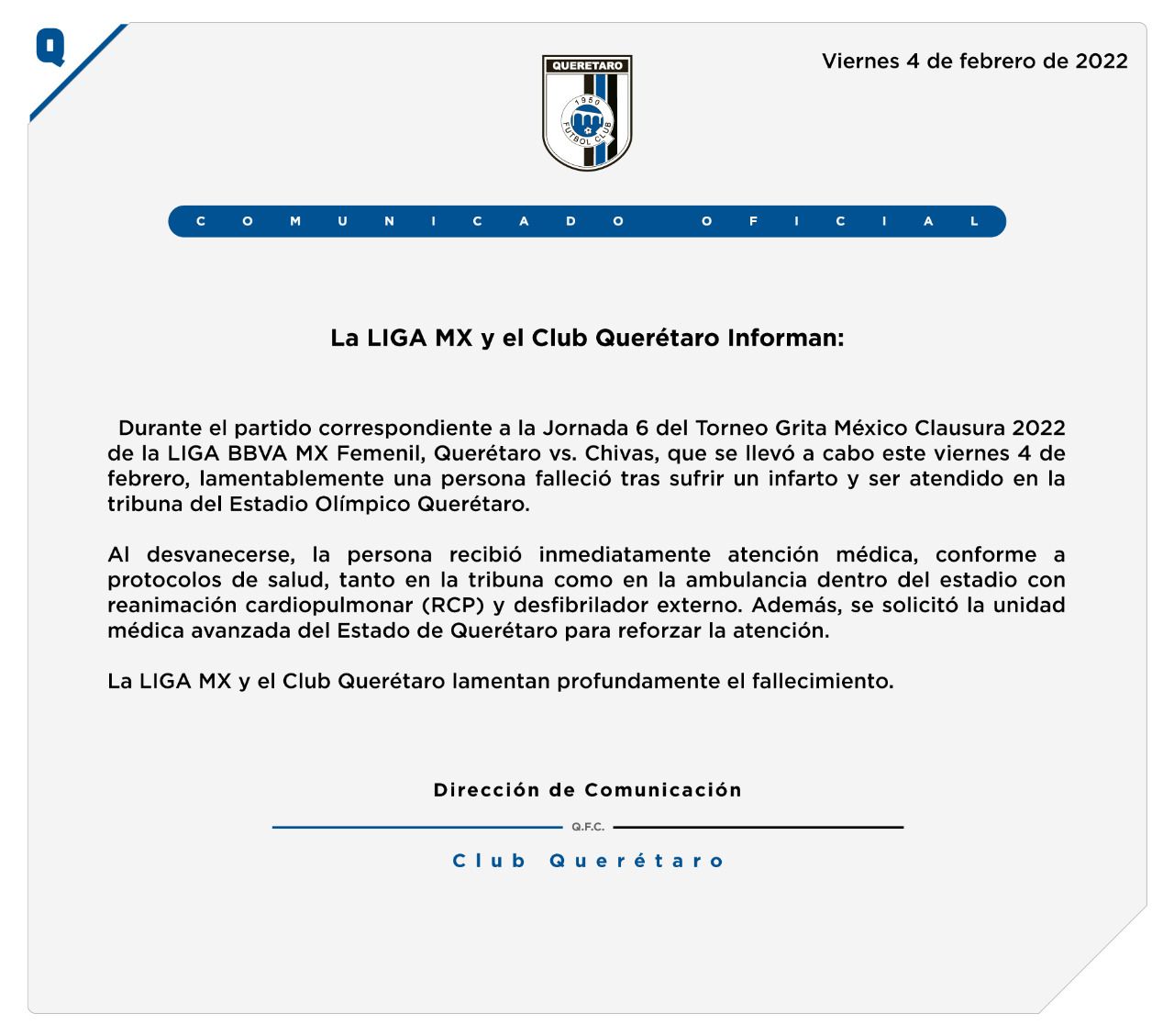 “Al desvanecerse la persona recibió inmediatamente conforme a los protocolos de salud, tanto en la tribuna como en la ambulancia dentro del estadio con reanimación cardiopulmonar (RCP) y desfibrilador externo. Además se solicitó la unidad médica avanzada del Estado de Querétaro para reforzar la atención. La Liga MX y el club Querétaro lamentan profundamente el fallecimiento“, indica el texto.