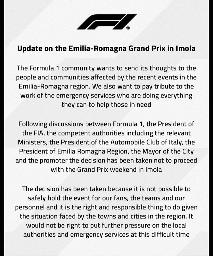 “Tras las discusiones entre la Fórmula 1, el presidente de la FIA, las autoridades competentes, incluidos los ministros pertinentes, el presidente del Automóvil Club de Italia, el presidente de la región de Emilia-Romaña, el alcalde de la ciudad y el promotor, se ha tomado la decisión de no continuar con el fin de semana del Gran Premio en Imola.