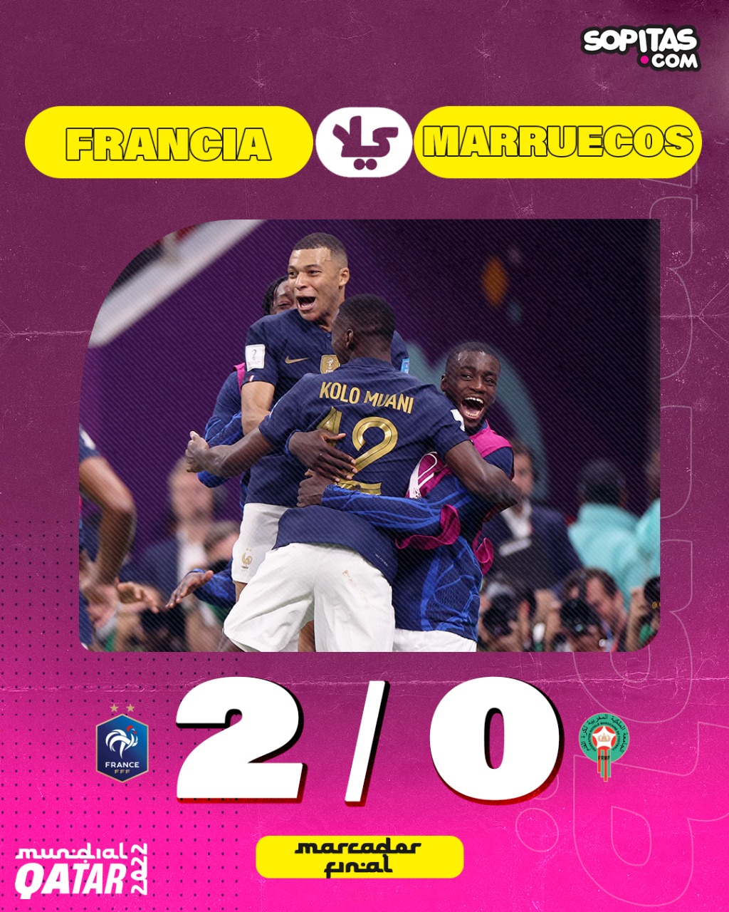 Sin embargo, cuando Marruecos jugaba mejor y merecía el gol del empate, y cuando Francia había renunciado al ataque, encontró el segundo gol, obra del recién ingresado Kolo Muani, tras un jugadón de Mbappé. Los marroquís quedaron sentenciados.