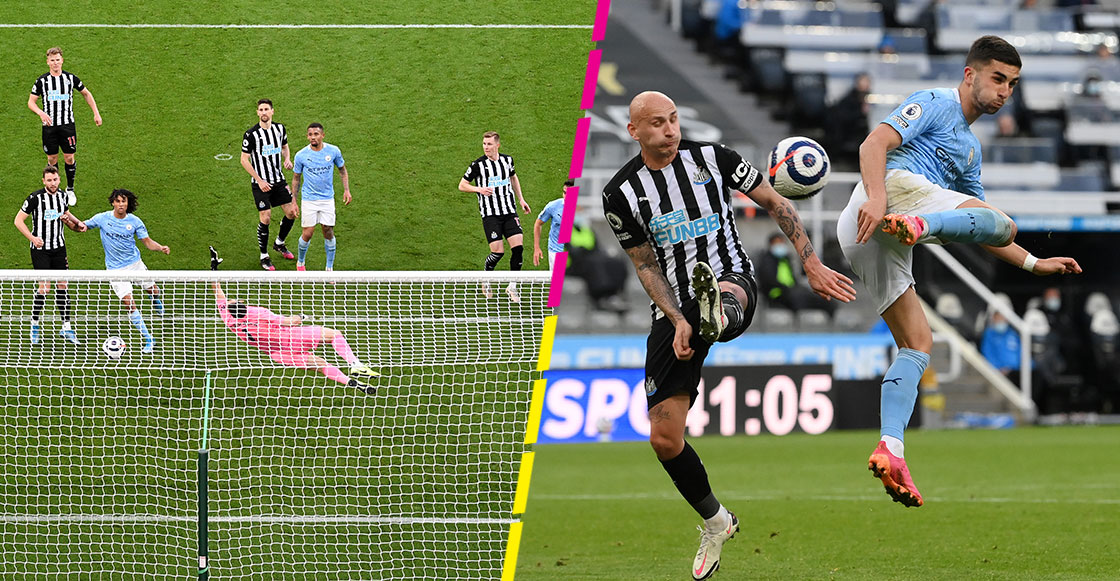Manchester City y Newcastle estaban empatados 1-1 en la parte final del primer tiempo cuando los de Pep Guardiola tuvieron a su favor un tiro libre y el español formado en el Valencia se elevó y mientras dio media vuelta en el aire, con la pierna derecha impactó de tacón.
