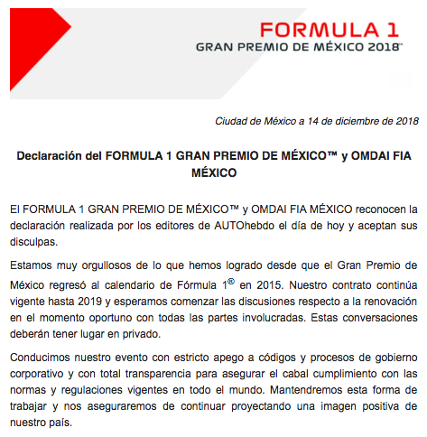 “El Fórmula 1 Gran Premio de México y OMDAI FIA México reconocen la declaración realizada por los editores de Autohebdo el día de hoy y aceptan sus disculpas”.