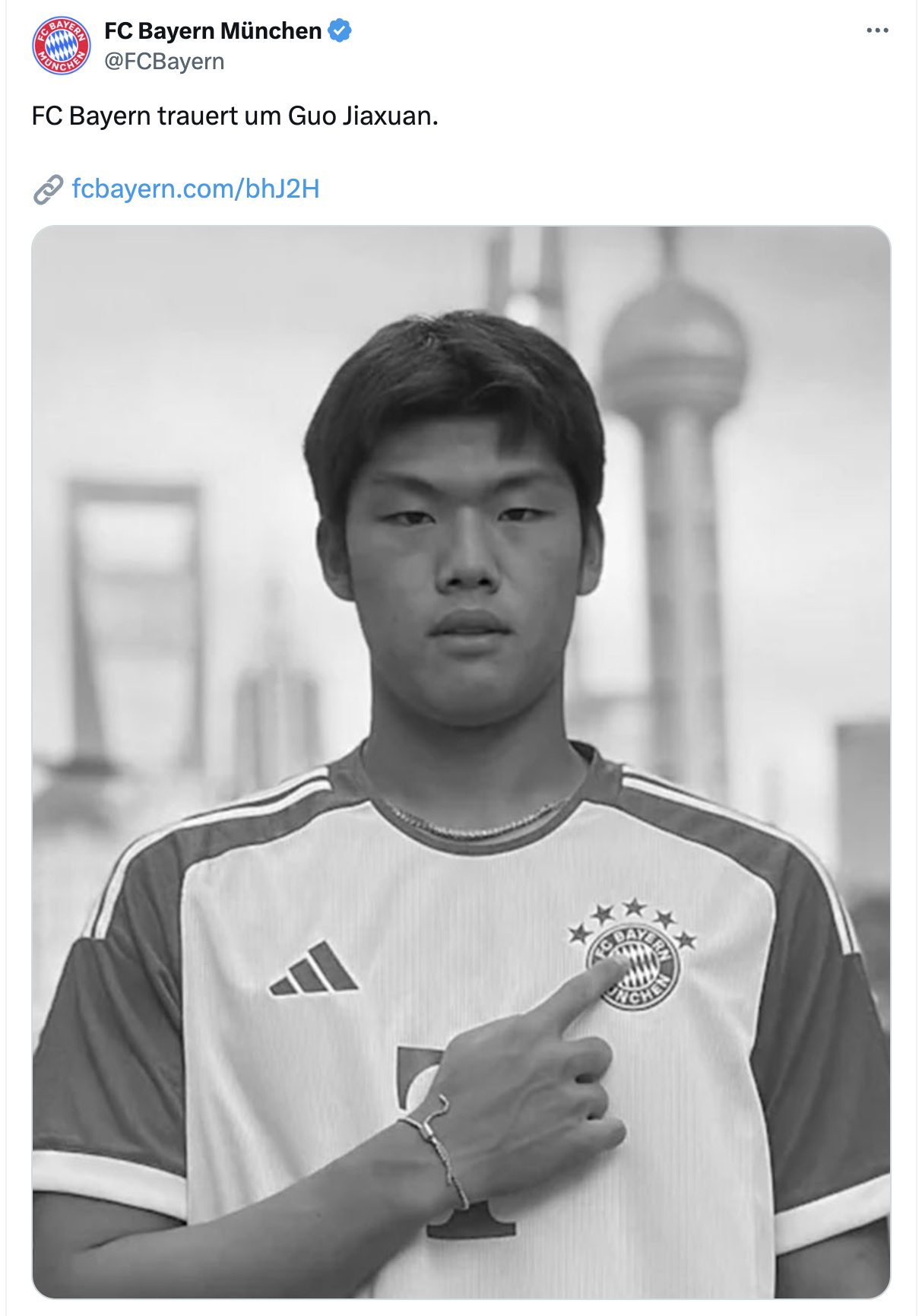 “El FC Bayern lamenta la pérdida de su exjugador de la selección mundial Guo Jiaxuan, fallecido a los 18 años en su China natal. Murió a causa de una grave lesión en la cabeza tras un trágico accidente durante un partido de entrenamiento en España el 6 de febrero. Los pensamientos del club están con su familia y amigos“.