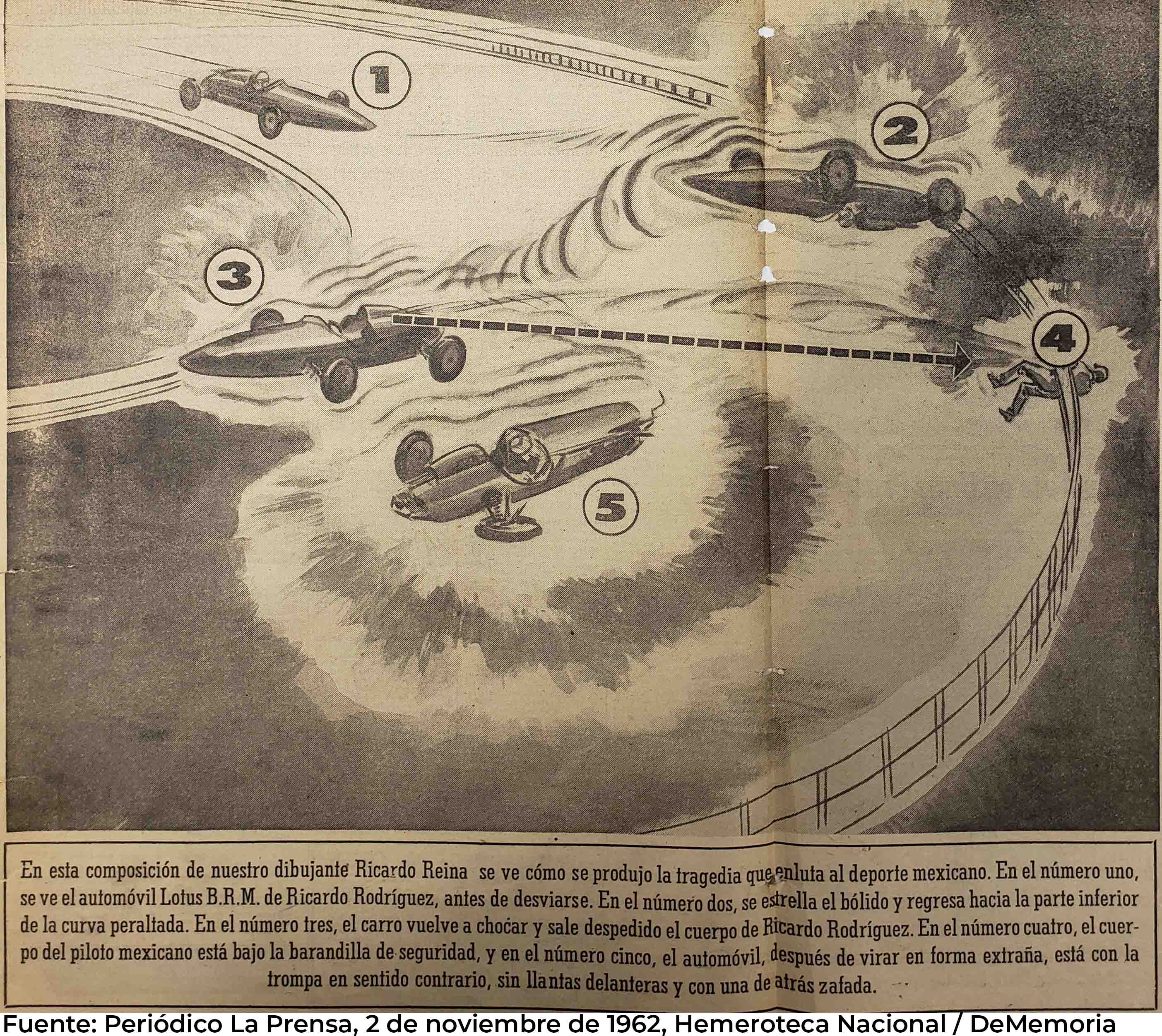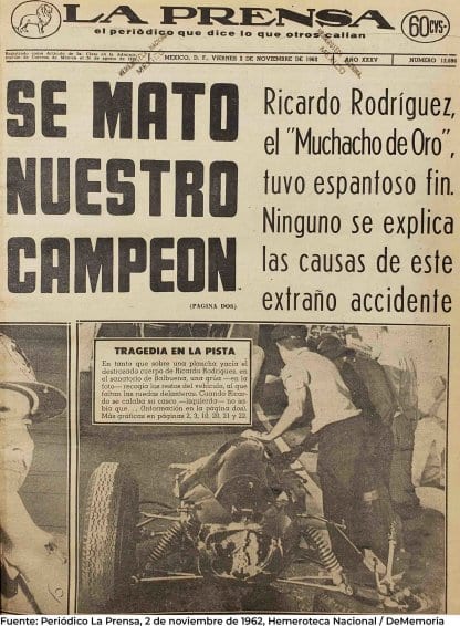 El día 2 de noviembre, los periódicos contaron la muerte del piloto mexicano: “Ricardo Rodríguez salió disparado del auto después del choque y murió instantáneamente”, decía el encabezado de La Afición. “Se mató nuestro campeón”, publicó La Prensa.
