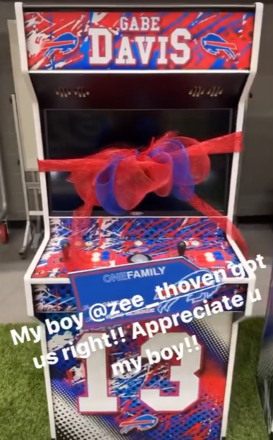 ¿Qué les regalo? Bueno, se aseguró de ser el mejor compañero del mundo y les dio unas máquinas de videojuegos totalmente personalizadas con los colores de los Bills y sus números.