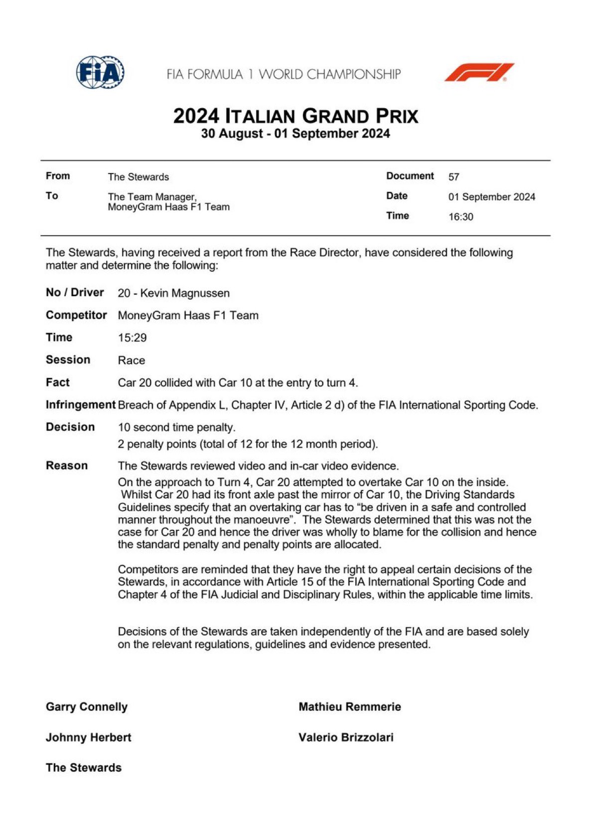 “Magnussen se perderá el GP de Azerbaiyán ya que la FIA confirmó que los puntos de penalización recibidos durante su enfrentamiento con Pierre Gasly en la carrera de hoy lo llevan a alcanzar el límite de 12 puntos de penalización en un período de 12 meses“.