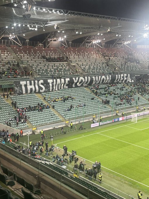 Para el juego de la ronda intermedia de la Conference League, UEFA ordenó la clausura de la cabecera en la cual se reúnen los ultras del Legia de Varsovia, considerados uno de los más peligrosos en Europa desde hace varios años, por lo cual ese sector lució prácticamente desierto, y solo lució una pancarta que la leyenda: “Esta vez ganaste, UEFA”.