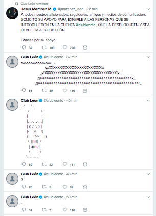 “A todos nuestros aficionados, seguidores, amigos y medios de comunicación, solicito su apoyo para exigirle a las personas que se introdujeron en la cuenta, que la desbloqueen y sea devuelta al club León”, dice en el mensaje.