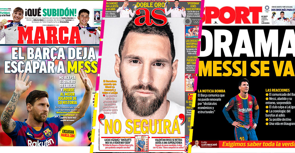 Sin embargo, a pesar de la línea editorial de cada uno, los cuatro diarios deportivos más importantes coincidieron en encabezados contundentes, así como los diarios más populares de información general, como El País y El Mundo, que fue el que reveló los detalles del contrato multimillonario entre Leo y la administración de Josep María Bartomeu.