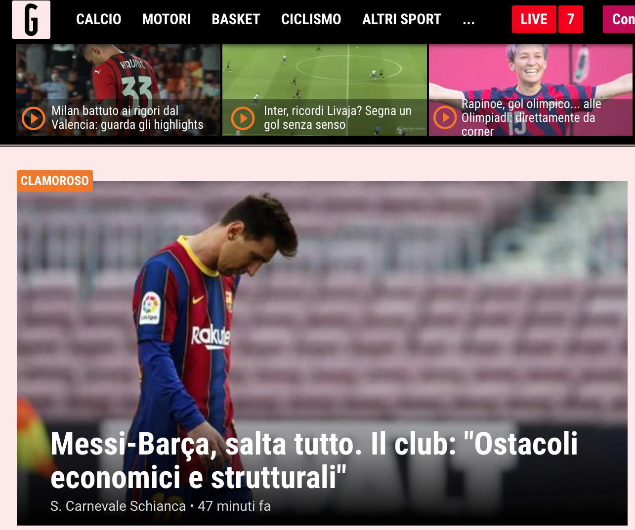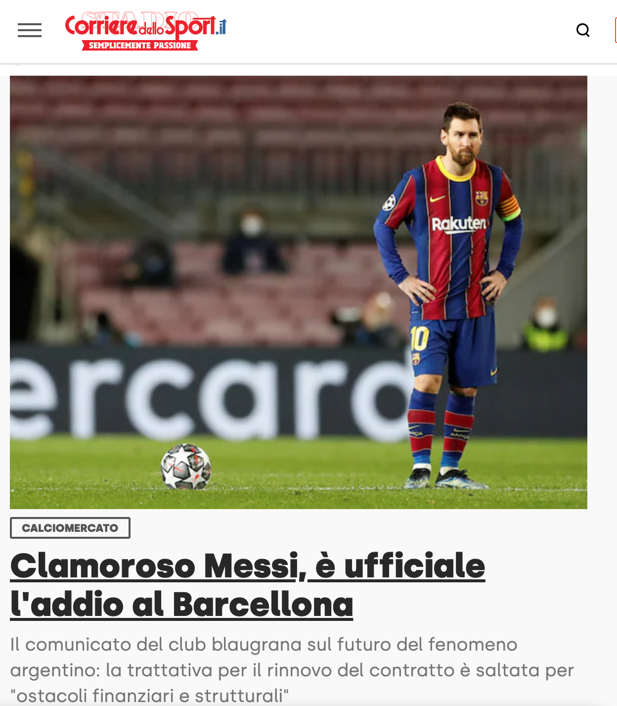 En Italia, La Gazzetta dello Sport y Corriere dello Sport fueron menos emotivos. “Barcelona-Messi salta todo: El club: ‘Obstáculos económicos y estructurales’, indica la Gazzetta, mientras que Corriere publica: “Messi rotundo, la despedida del Barcelona es oficial”.