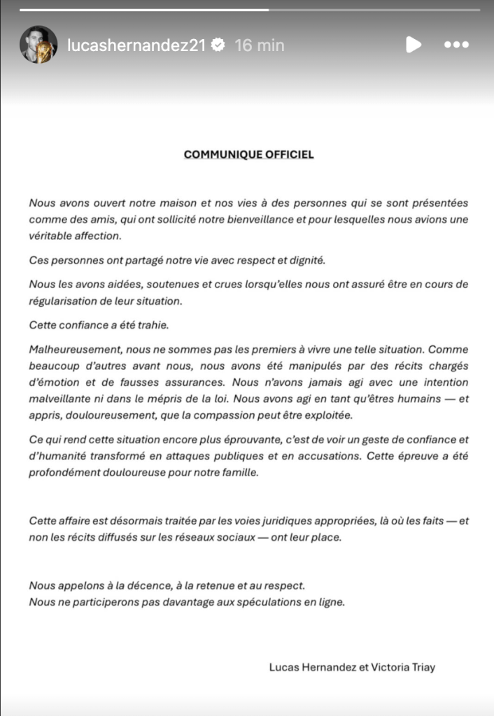 Tras darse a conocer las acusaciones en su contra, Lucas Hernández y su esposa compartieron un comunicado en el que aseguran que ellos fueron los engañados. Contrataron a la familia porque les dijeron que estaban en proceso de regularizar su situación legal en Francia.