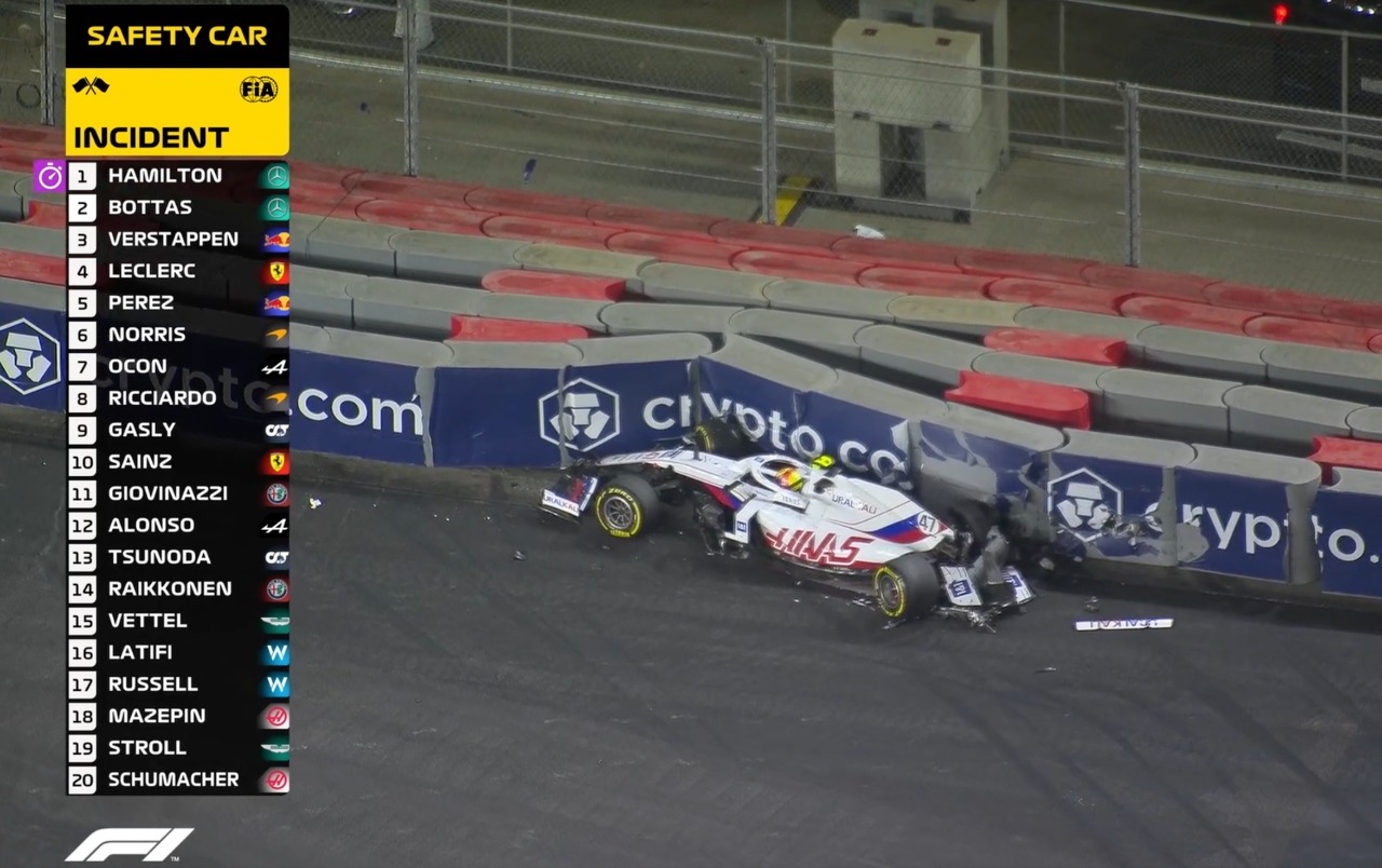 La primera bandera amarilla llegó en la décima vuelta, cuando Mick Schumacher perdió el control de su auto y se fue contra el muro de contención, como Leclerc en las prácticas libres.