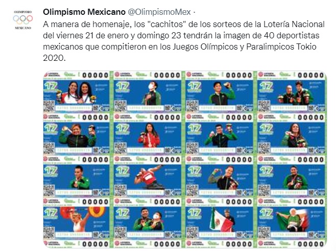 Lo anterior quiere decir que las imágenes de los más de 40 atletas que lograron una presea en los pasados juegos olímpicos y paralímpicos de Tokio engalanarán los cachitos de los sorteos que se realizarán los días 21 y 23 de enero.