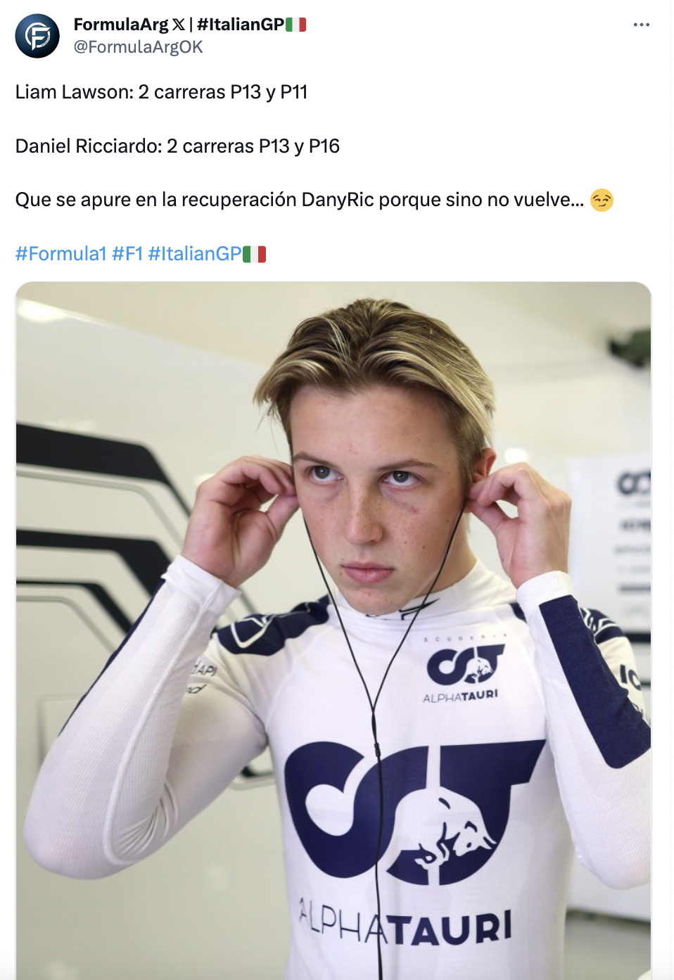 ¿Se acuerdan de Daniel Ricciardo? Pues en una de esas y el australiano ya ni vuelve a AlphaTauri, pues Liam Lawson le está comiendo el mandado. Ricciardo terminó 13 y 16 en las carreras antes de sufrir la fractura en la mano, mientras que el neozelandés terminó 13 y 11 en sus dos carreras disputadlas hasta ahora así que nada le faltó para sumar su primer punto.