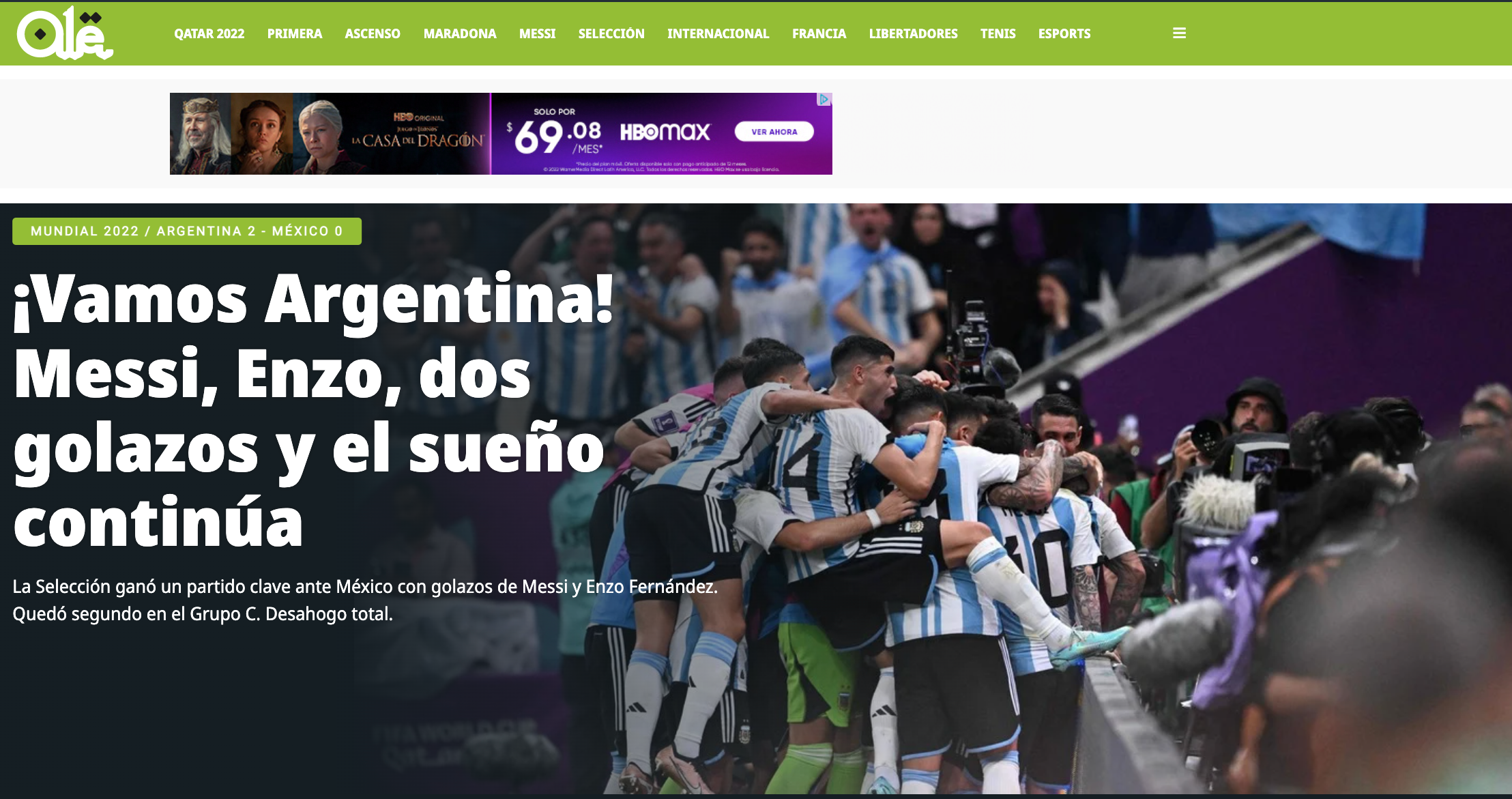 Más efusivo fue el Dairo Olé, el más importante entre medios deportivos de Argentina, que de verdad festejó el triunfo en su nota principal. “¡Vamos Argentina! Messi, Enzo, dos golazos y el sueño continúa”.