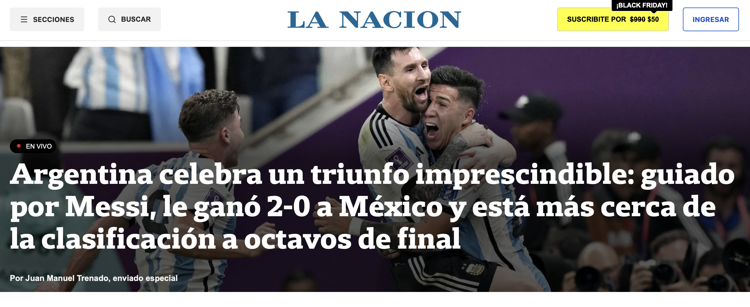 TyC Sports no se quedó atrás y coincidió con Clarín al calificar el duelo contra México como un partido genial de Messi: “El grito de guerra y el golazo para el triunfo de la Selección Argentina en el Mundial”.