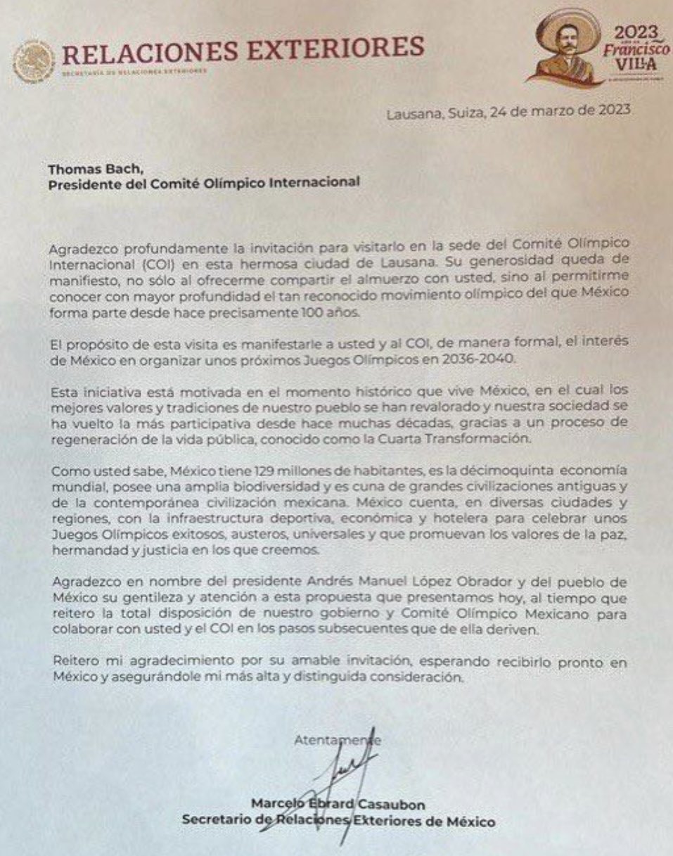 “El propósito de esta visita es manifestarle a usted y al COI, de manera forma, el interés de México en organizar unos próximos Juegos Olímpicos en 2036-2040. México cuenta, en diversas ciudades y regiones, con la infraestructura deportiva, económica y hotelera para celebrar unos Juegos Olímpicos exitosos, austeros, universales y que promuevan los valores de la paz, hermandad y justicia en los que creemos“, expresa la carta firmada por Ebrard.
