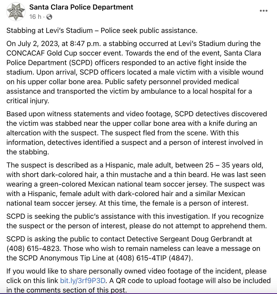 Las autoridades de Santa Clara, California, están en busca del agresor que apuñaló a una persona en las tribunas del estadio de los San Francisco 49ers durante el partido entre México y Qatar el domingo 2 de julio, en el cierre de la fase de grupos de la Copa Oro, en el cual el Tri cayó por la mínima diferencia.