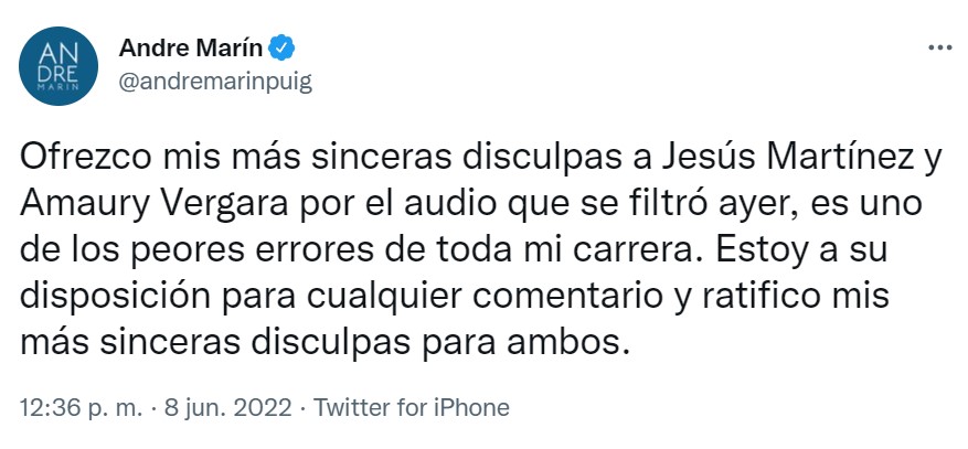 “Ofrezco mis más sinceras disculpas a Jesús Martínez y Amaury Vergara por el audio que se filtró ayer, es uno de los peores errores de toda mi carrera. Estoy a su disposición para cualquier comentario y ratifico mis más sinceras disculpas para ambos”, fue el mensaje completo del periodista en su cuenta de Twitter.