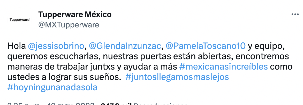 “Hola Jessica Sorbino, Glenda Inzunza, Pamela Toscano y equipo. Queremos escucharlas, nuestras puertas están abiertas, encontremos maneras de trabajar juntxs y ayudar a más mexicanas increíbles como ustedes a lograr sus sueños”, dice la respuesta de la firma.