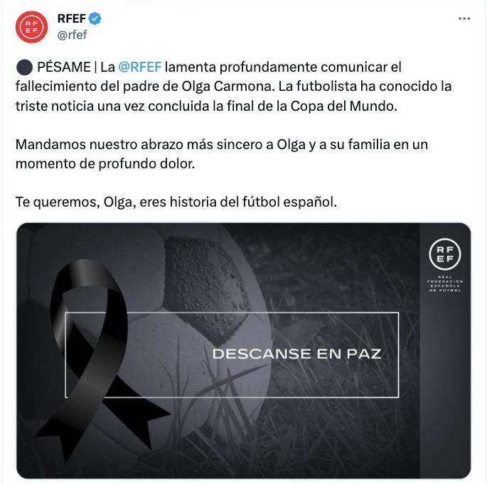 El Real Madrid, equipo en el que juega Olga, también emitió un comunicado para expresar sus condolencias a Carmona de tan solo 23 años de edad.