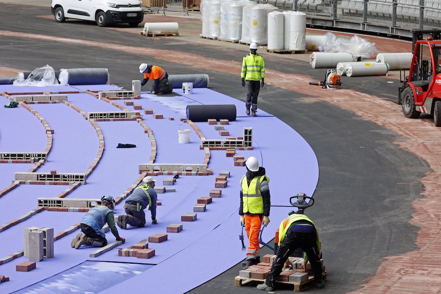 Si bien los planes de París 2024 marchan sobre el calendario, aún hay 22 obras en marcha, una de ellas en el Stade de France, en el cual se instala una pista de tartán de color violeta.