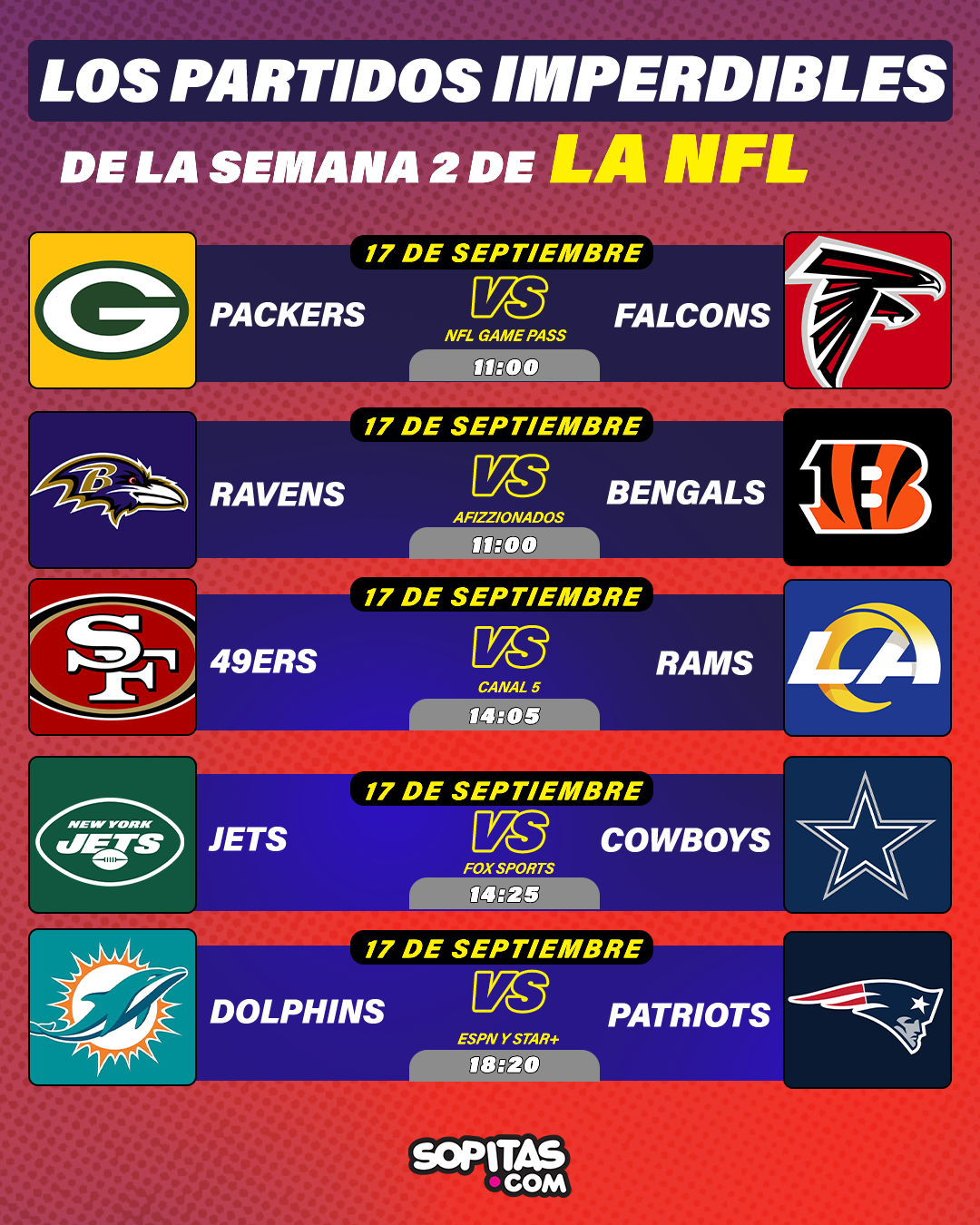 | Dolphins | vs | Patriots | Domingo 17 de septiembre | ESPN y Star+ | 18:20 horas |