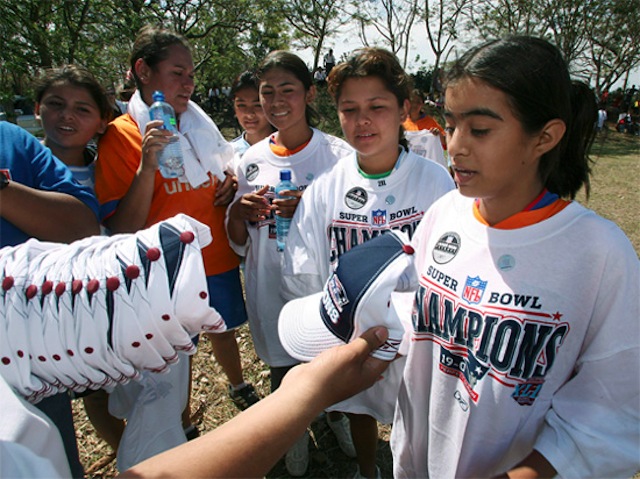 Por ejemplo, después de perder el Super Bowl XLIII en el 2009, todos los artículos de los Arizona Cardinals fueron enviados a refugios que se encargan a niños en situación de calle en El Salvador. Para el 2010, después de que Nueva Orleans derrotó a Indianápolis, las camisetas del equipo perdedor fueron donadas a las víctimas del terremoto de Haití.