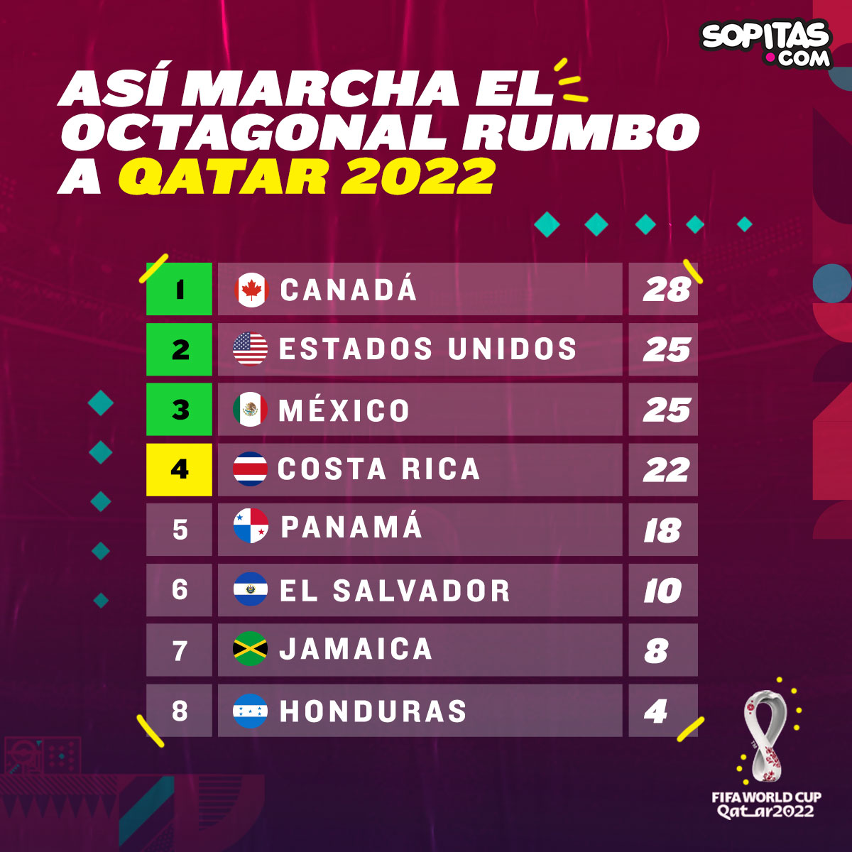 Detrás de México se encuentra Costa Rica, con 22 unidades. Para que México califique al Mundial contra El Salvador en la siguiente jornada necesita un triunfo o un empate para llegar o superar la barrera de las 26 unidades.