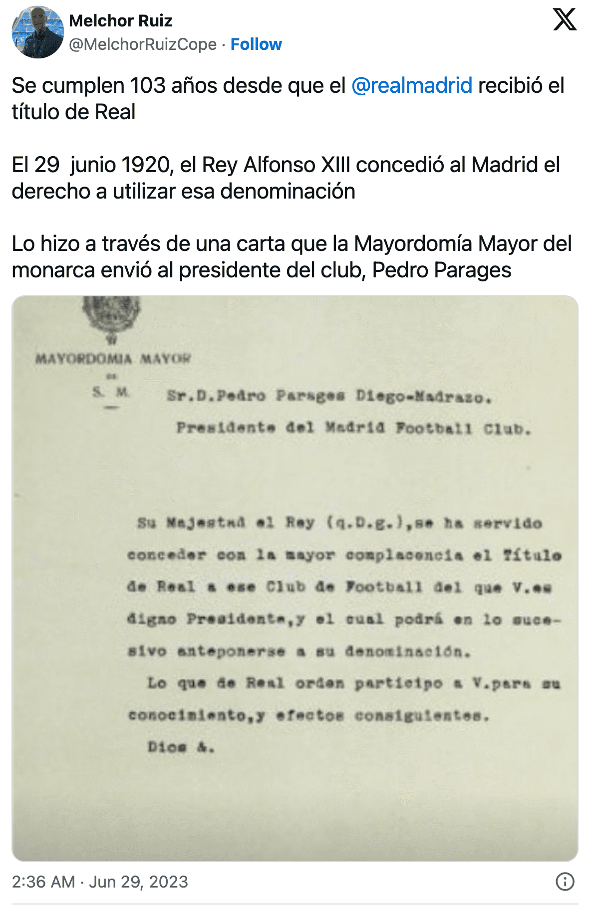 2.- No se llama Real Madrid nada más porque sí; tiene el título de “Real”