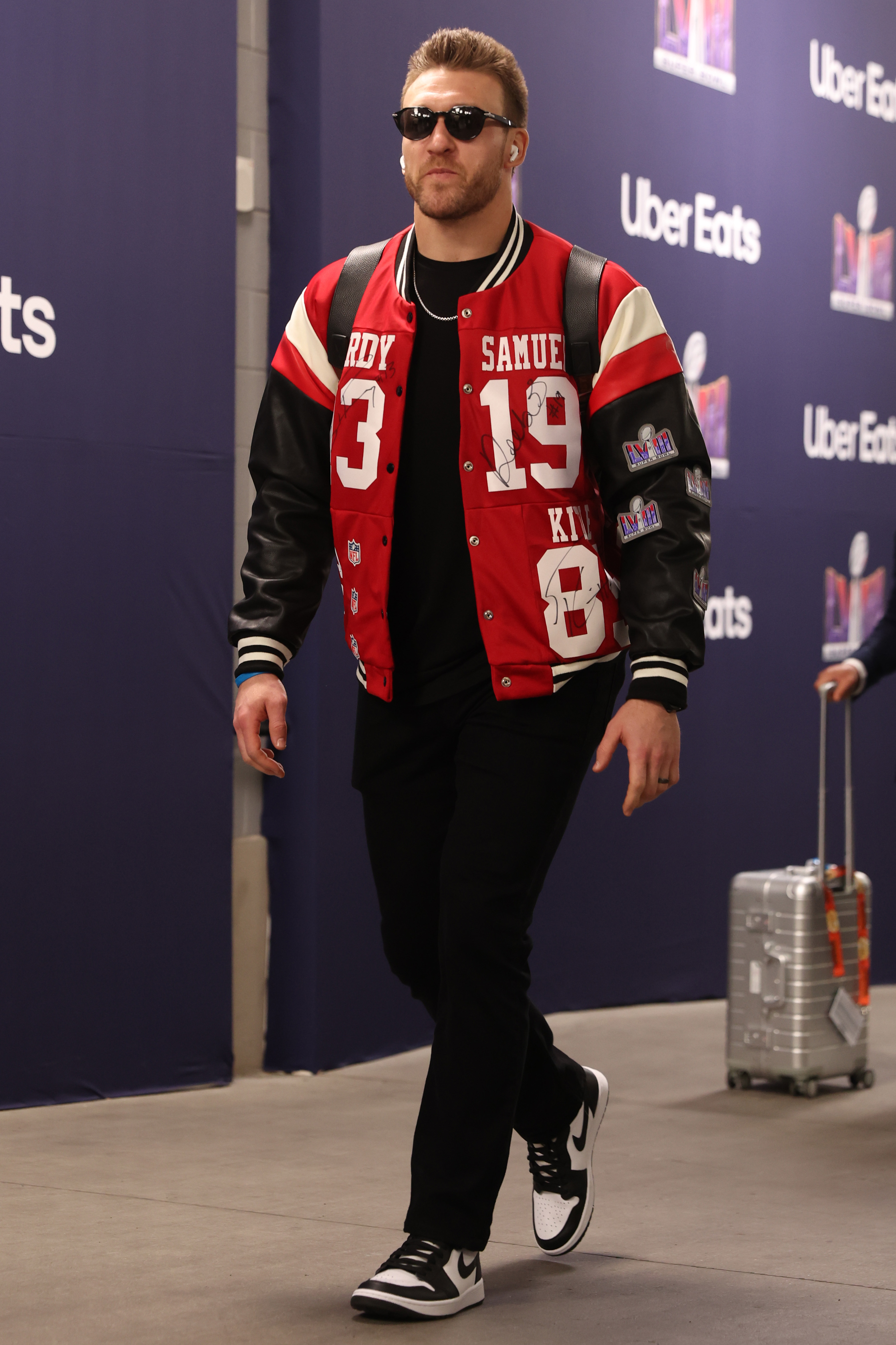 Uno de los aspectos importantes, son los outfits y Kyle Juszczyk llegó con una chamarrita diseñada y creada por su esposa, Kristin. Hace unas semanas diseñó ropa para Taylor Swift, pero ahora como son rivales, nanay.