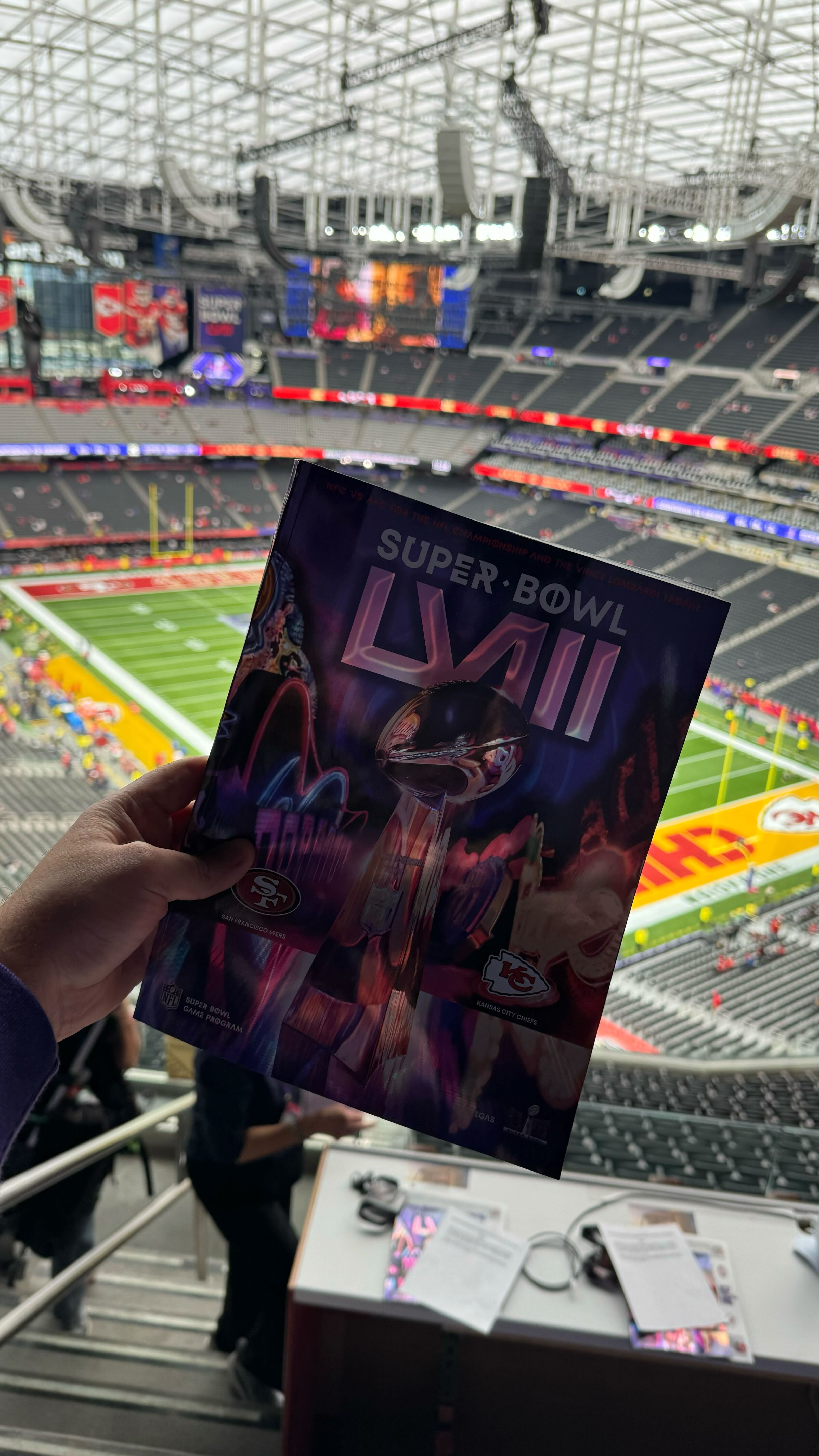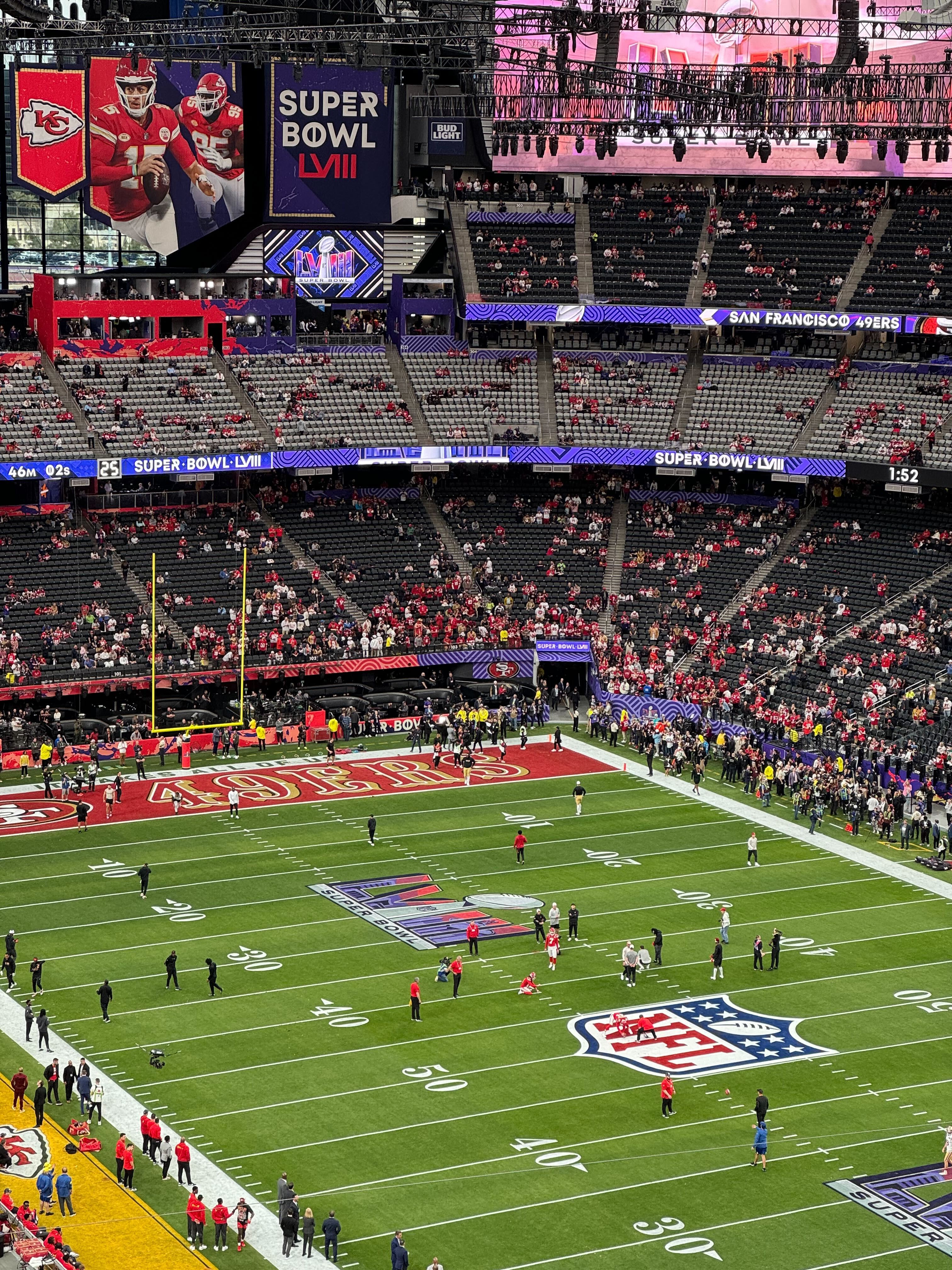 Ambos equipos ya están calentando en el Allegiant Stadium y tenemos un lugar privilegiado para ver el Super Bowl LVIII, miren nada más la chulada de foto que tomamos para nuestros seguidores.
