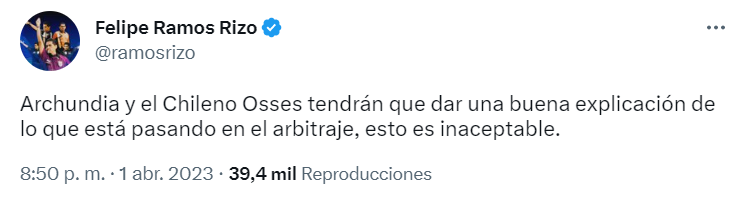 Y la polémica está encendida en redes sociales por la supuesta agresión. Felipe Ramos Rizo se encargó de mandarle un mensajito a Armando Archundia, mandamás del arbitraje en México.