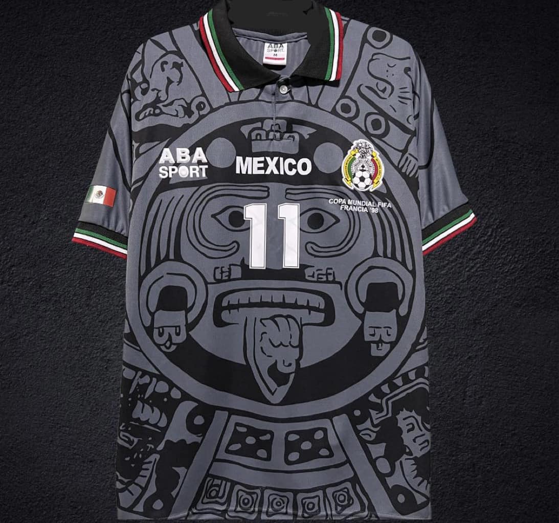 Ese mítico uniforme fue elaborado por la marca mexicana ABA Sport, que compitió con otras marcas transnacionales, entre ellas Nike y Adidas, y finalmente ganó el concurso tras presentar el boceto de la versión con la Piedra del Sol Azteca.