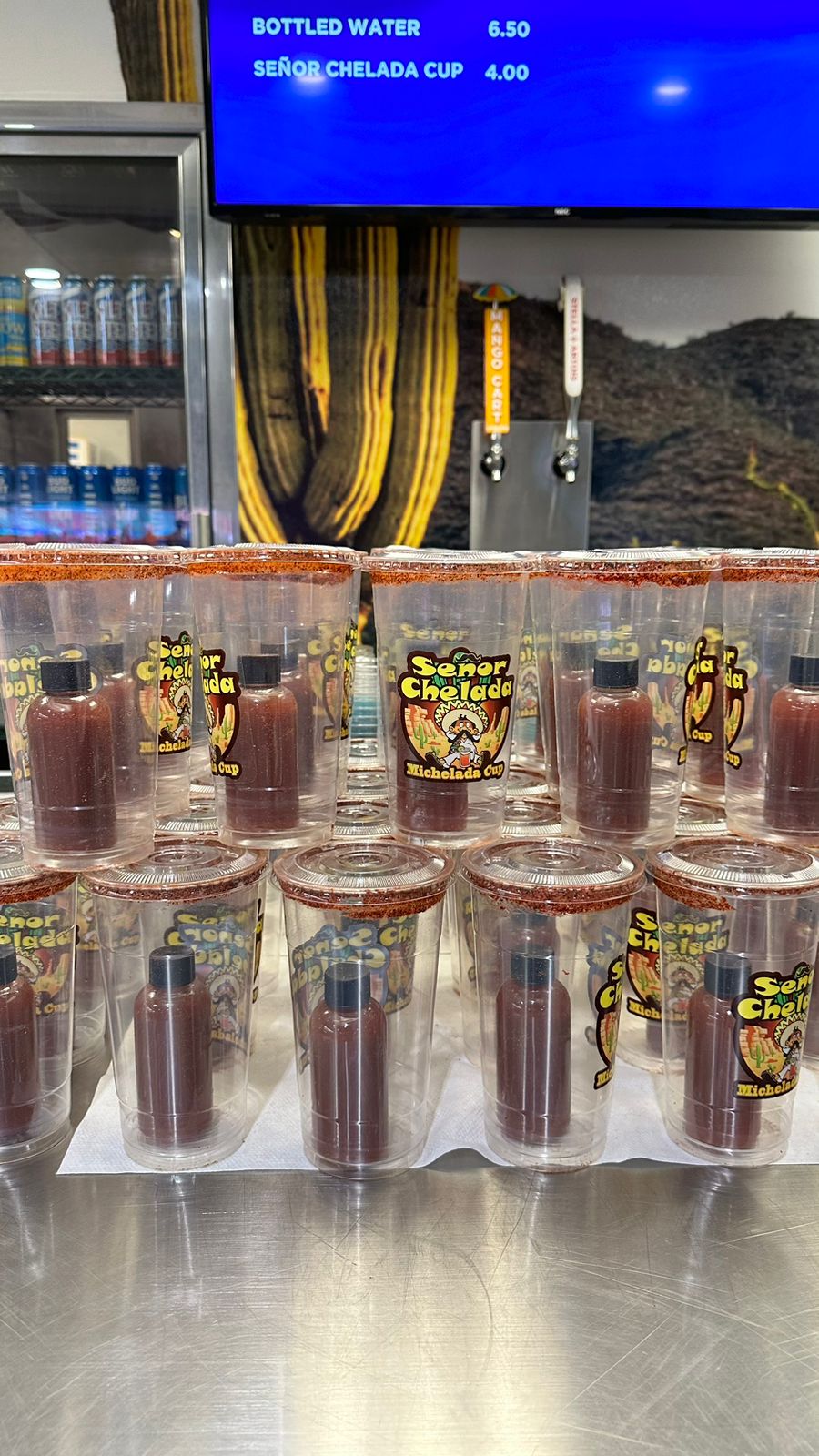 Hamburguesas: 12 dólares Agua: 6.50 dólares Refresco: (Quesque porque te venden el vaso conmemorativo) 12 dólares Chela: 16 dólares Vino: 19 dólares Ron, gin, whisky, tequila, mezcal: 22 dólares