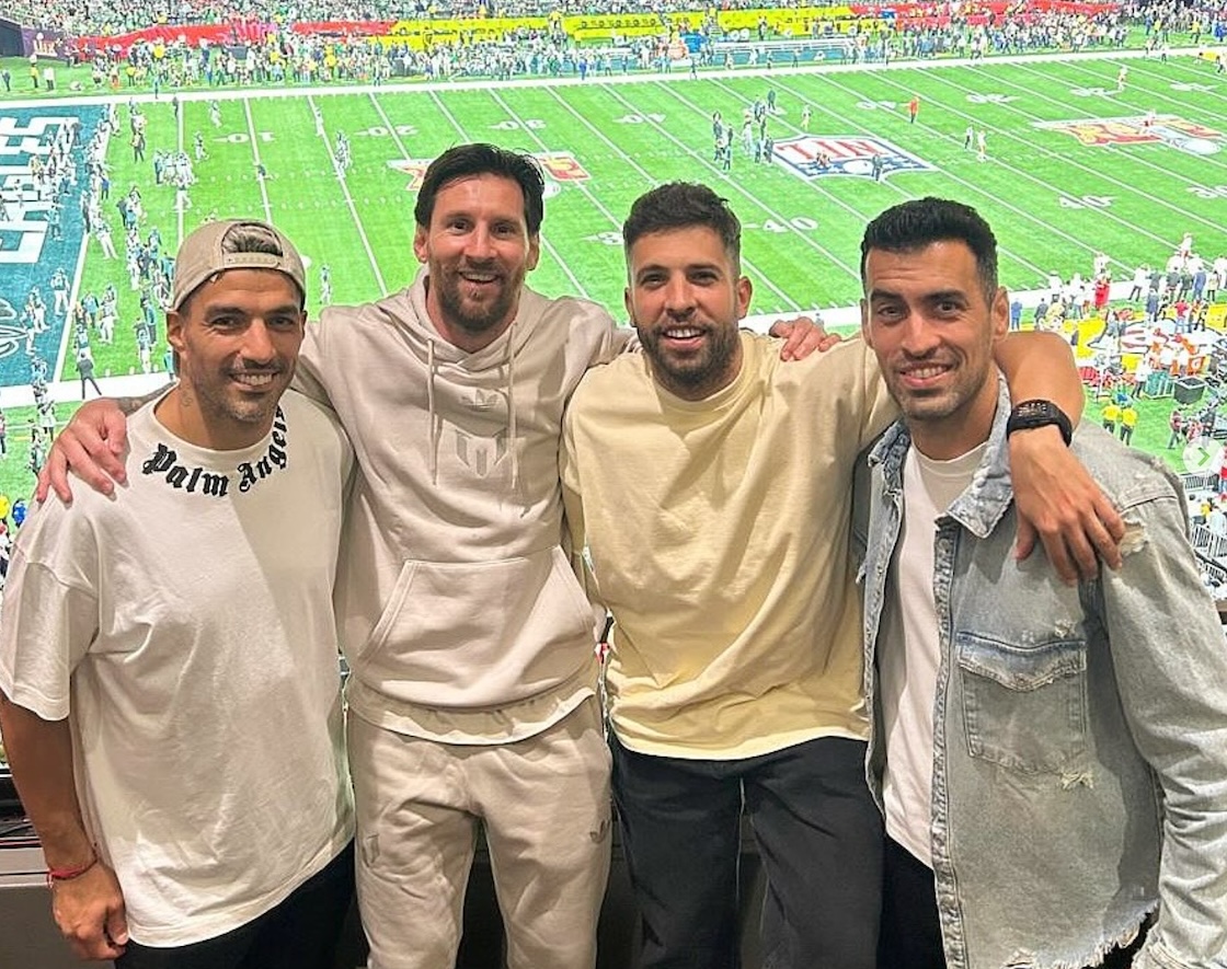 Lionel Messi fue otra de las celebridades que se dieron cita en Nueva Orleans para disfrutar del partido y reencontrarse en la tribuna con sus excompañeros del Barcelona: Luis Suárez, Jordi Alba y Sergio Busquets.