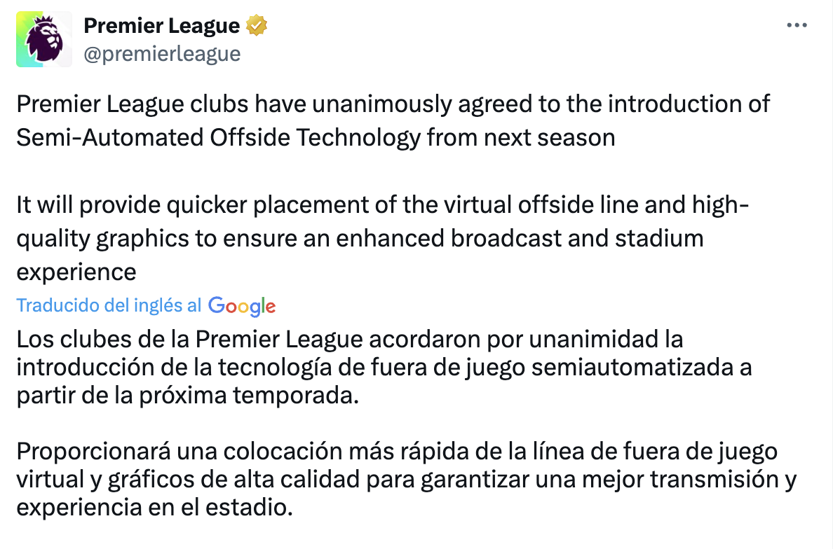 La Premier League podría ser la primera liga del mundo en aplicar la tecnología semiautomatizada del fuera de lugar. Anunciaron en un comunicado que tras alguna fecha FIFA de otoño (es decir, entre septiembre y diciembre) podría empezar a aplicarse.