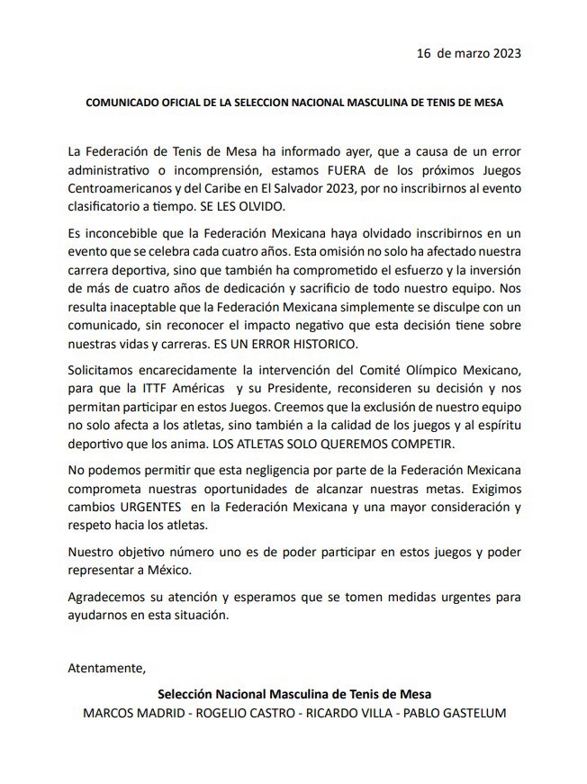 “La Federación de Tenis de Mesa ha informado que a causa de un error administrativo o incomprensión, estamos fuera de los Juegos Centroamericanos y del Caribe en El Salvador 2023, por no inscribirnos al evento clasificatorio a tiempo. Se les olvidó.
