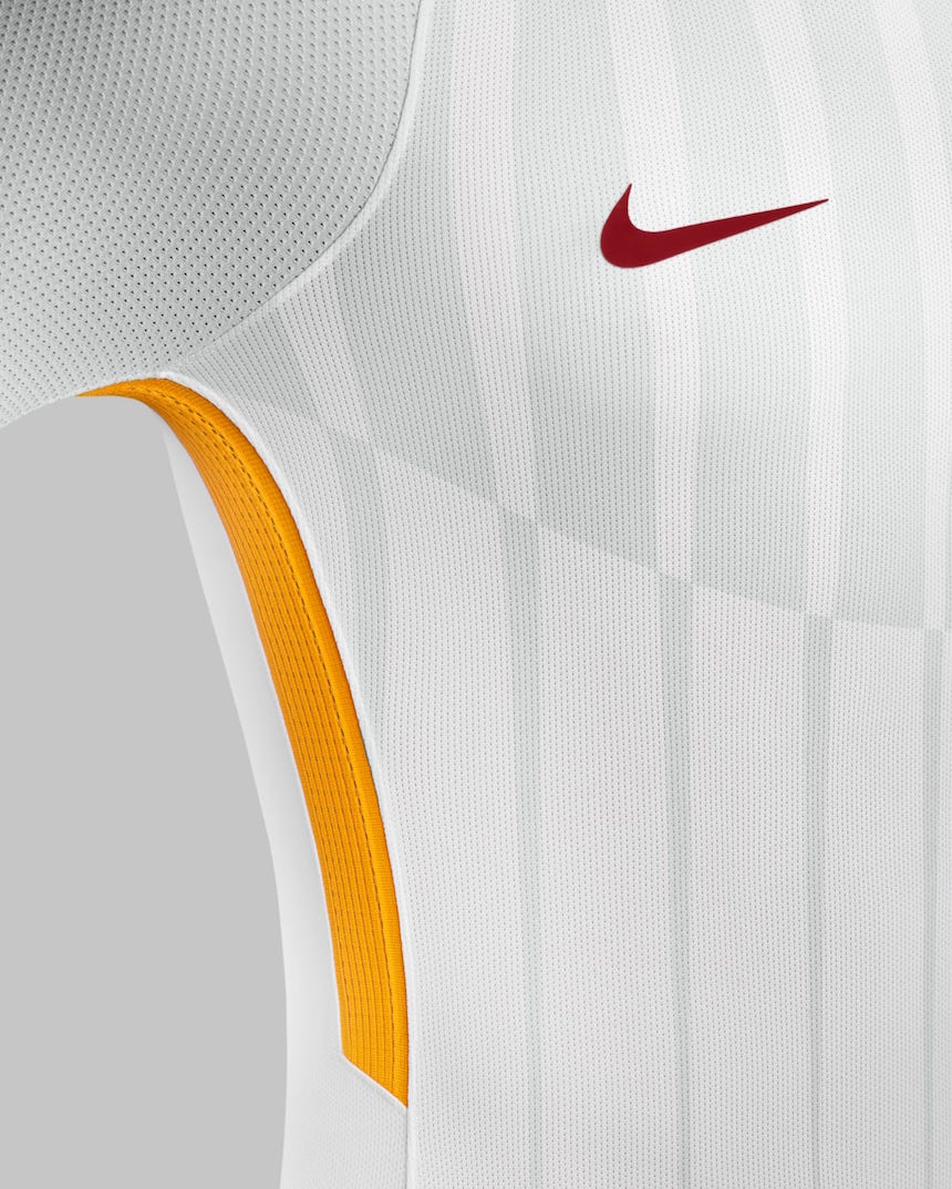 Dicen que a veces menos es más y en esta ocasión aplica a la perfección. La equipación de la Roma para jugar en estadios ajenos es de color blanco, con vivos en dorado y también en su color rojo vino. El pecho se distingue con líneas y tonos de grises que se van difuminando hasta el final de la camiseta.