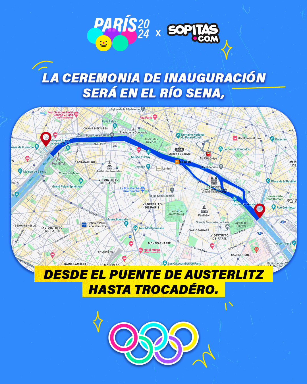 El recorrido de cada delegación iniciará en el puente de Austerlitz y recorrerán un total de seis kilómetros hasta el Trocadéro, que es la entrada a la Torre Eiffel, donde se llevará a cabo el resto de la ceremonia de inauguración, entre ellas el encendido olímpico.