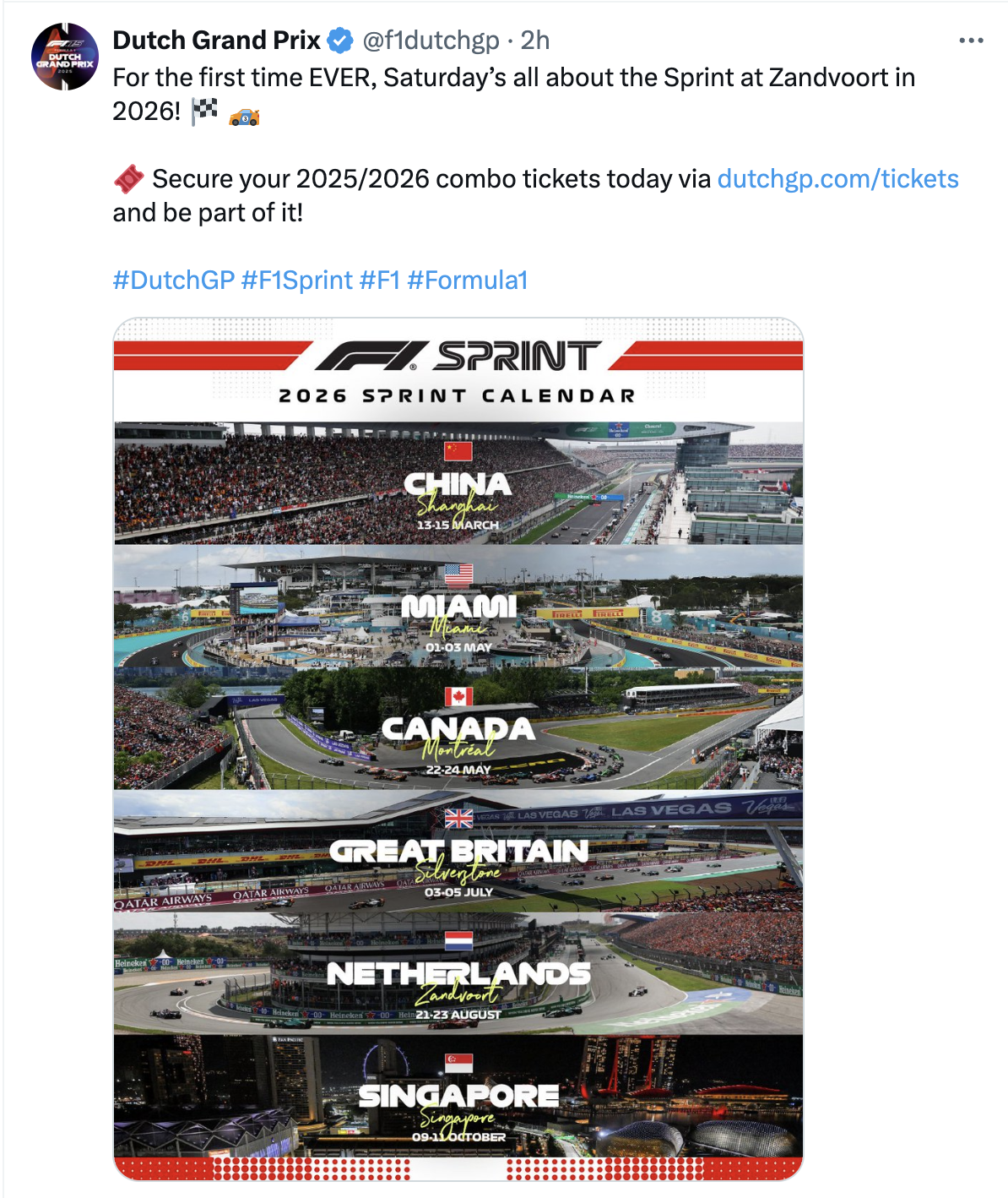 Ya tenemos confirmadas las fechas de las Sprint Race de la temporada 2026 de la Fórmula 1. La cuenta oficial del Gran Premio de Países Bajos se adelantó con el anuncio en X.